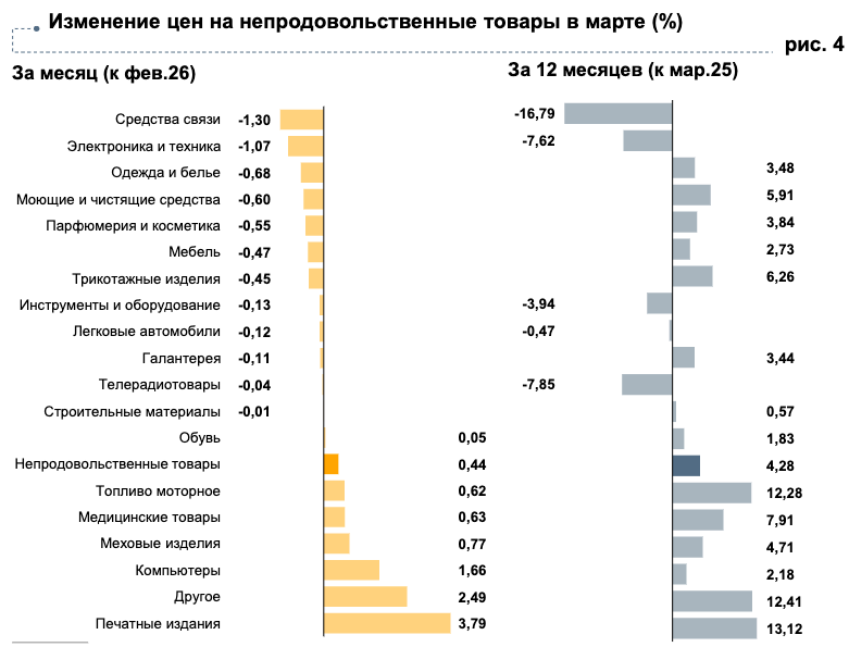 В марте при этом подешевели средства связи, электроника и техника из-за постепенного снижения спроса на фоне охлаждения потребительского кредитования. В целом за год средства связи подешевели на 16,8 %, электроника и техника — на 7,6 %.