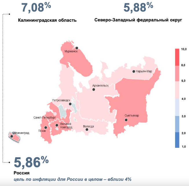 По итогам марта 2026 года годовая инфляция в Калининградской области составила 7,08 % после 7,83 % в январе и 6,97 % в ферале. Как сообщает Центральный банк РФ, показатель по региону на 20,9 % превышает среднероссийский (5,86 %).