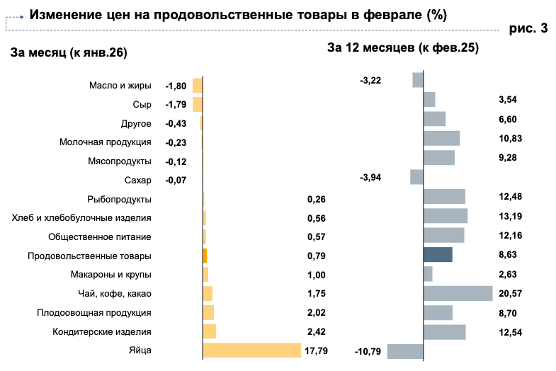«Больше остальных подорожали яйца: производители переносили в цены возросшие затраты на корма, ветпрепараты, коммунальные услуги и логистику, хотя за год продукт в итоге подешевели на 10,8 % благодаря росту производства по стране. Подорожали и кондитерские изделия — торты, конфеты, зефир и шоколад, поскольку в их стоимость продолжили закладывать более высокие расходы на сырьё, обслуживание оборудования и логистику; за год эта категория выросла в цене на 12,54 %.