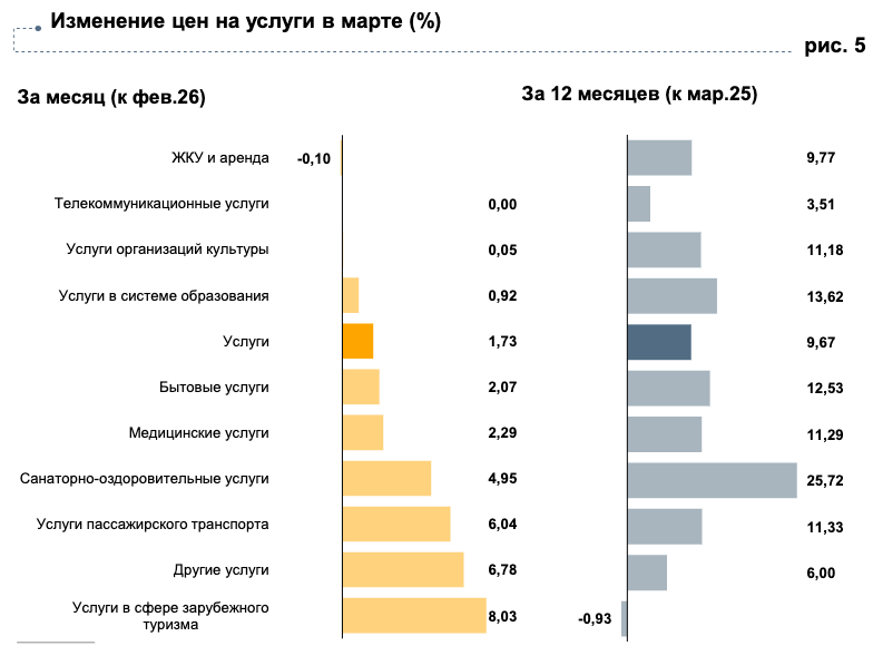 Если говорить об услугах, то заметно выросли цены на услуги зарубежного туризма из-за увеличения спроса и ослабления курса рубля в марте, что привело к удорожанию поездок по большинству направлений, хотя за год они в целом подешевели на 0,93 %. Также значительно подорожали услуги почтовой связи вследствие индексации тарифов на отправку писем, бандеролей и посылок.