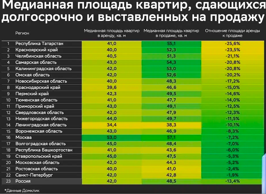 В исследовании отмечено, что в большинстве крупных регионов «выставленные на продажу квартиры просторнее арендных». В среднем по России в указанный период медианная площадь арендных квартир — 42 квадратных метра, что на 13,4 % меньше, чем у жилья в продаже (48,5 кв. м).