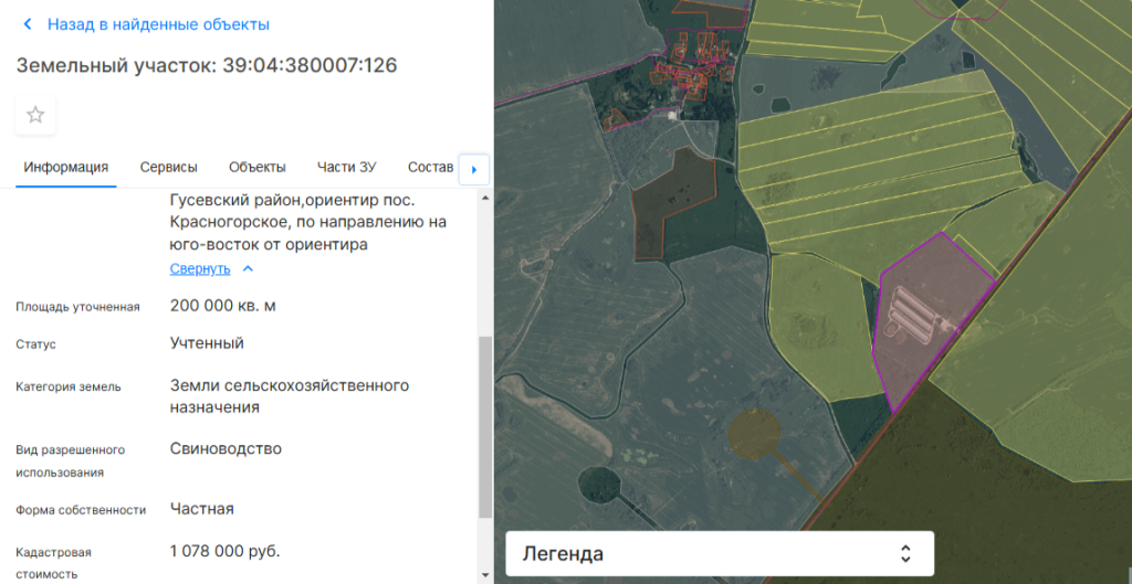 Строительство откормочника запланировано на участке с кадастровым номером 39:04:380007:126 площадью 20 га в районе поселка Юдино. Массив относится к землям сельхозназначения и предназначается под «свиноводство». В его границах уже работает свинокомплекс. Объект находится в 3 км от Гусева.