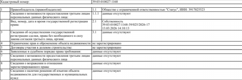 Как следует из ЕГРН, буквально 13 марта 2026 года участок 39:03:010027:1168 с незавершенной стройкой ЖК в Гурьевске был перепродан компании «Статус» Михаила Даниловского — менеджера другого бизнесмена-застройщика и депутата горсовета Калининграда от партии «Единая Россия» Александра Колодяжного. Даниловский руководит ООО «Статус» с января 2019 года. А Колодяжный переоформил на него свою компанию только в декабре 2024 года. Какие-либо другие юрлица на Даниловского не зарегистрированы. Юрлицо «Статус» работает с 2005 года и зарегистрировано тоже в Гурьевске на Калининградском шоссе, 23а.
