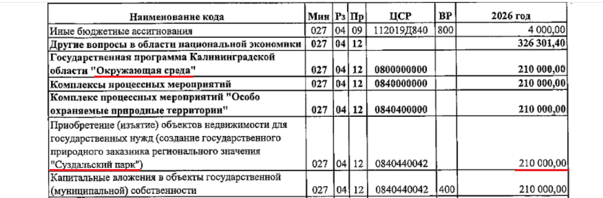 В общей сложности на приобретение (изъятие) объектов недвижимости для государственных нужд, а именно создание государственного природного заказника регионального значения «Суздальский парк» предусматривается 210 млн руб. Финансирование проходит по госпрограмме Калининградской области «Окружающая среда» в рамках комплекса процессных мероприятий «Особо охраняемые природные территории».