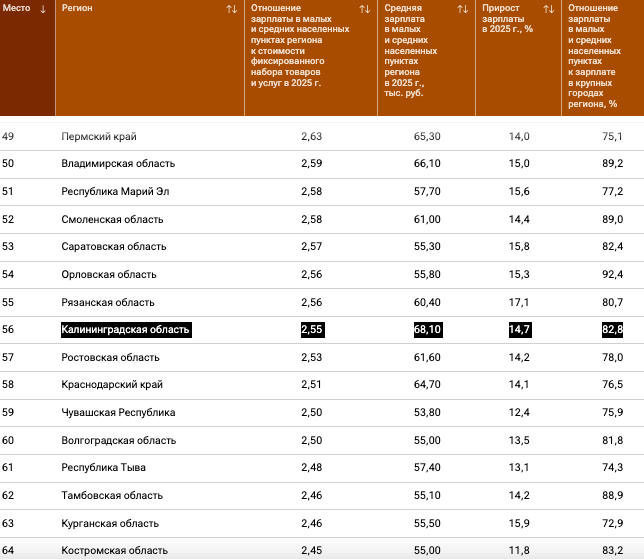 Показатель отношения зарплаты в малых и средних населенных пунктах к стоимости фиксированного набора товаров и услуг в регионе по итогам 2025 года составил 2,55 (2,21 в 2024-м). При этом средняя зарплата за пределами областного центра составила 68,1 тыс. руб. (59,4 тыс. руб.) — по этому показателю регион на 34 месте; прирост зарплаты в прошлом году составил 14,7 %.