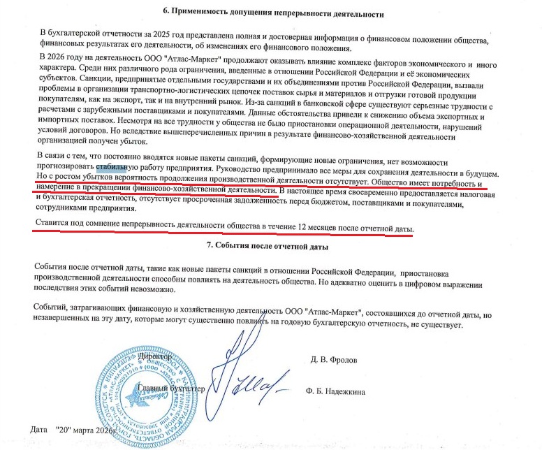 В пояснениях к бухгалтерскому отчету компании отмечается, что «Атлас-Маркет» «ставит под сомнение» непрерывность свой деятельности в следующие 12 месяцев. Более того, отмечается, что у предприятия есть «потребность и намерение в прекращении финансово-хозяйственной деятельности».