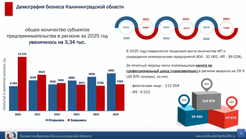 В 2025 году самозанятым Калининградской области были начислено 3,5 млрд руб. в качестве налога на профессиональный доход. Соответствующие данные приводятся в докладе врио уполномоченного по защите прав предпринимателей в Калининградской области Олеся Белая.