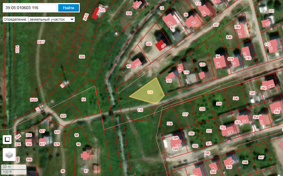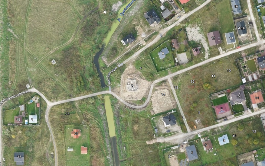 По данным из ЕГРН, массив 39:05:010603:116 предназначается для индивидуального жилищного строительства и существует с сентября 2009 года. Как указано на актуальной спутниковой карте сервиса «Яндекс», западная граница участка проходит ровно посередине под строящимся ИЖД, который по факту занимает оба соседних массива 39:05:010603:116 и 39:05:010603:115. Возведение дома началось относительно недавно, не ранее 2024 года. Более того, строение преграждает путь дорожке, которая ведет к пешеходному мостику через реку Тростянку от ул. Донской и Кремлевской к переулку Авангардному на границе с Сокольниками. Расположение дома никак не согласуется с ГПЗУ участка, право аренды которого разыгрывала администрация, ни с текущими кадастровыми границами землевладений. Участок 39:05:010603:115, на котором строится часть дома, имеет площадь 604 кв. м и находится в частной собственности текущего владельца только с 30 сентября 2025 года.