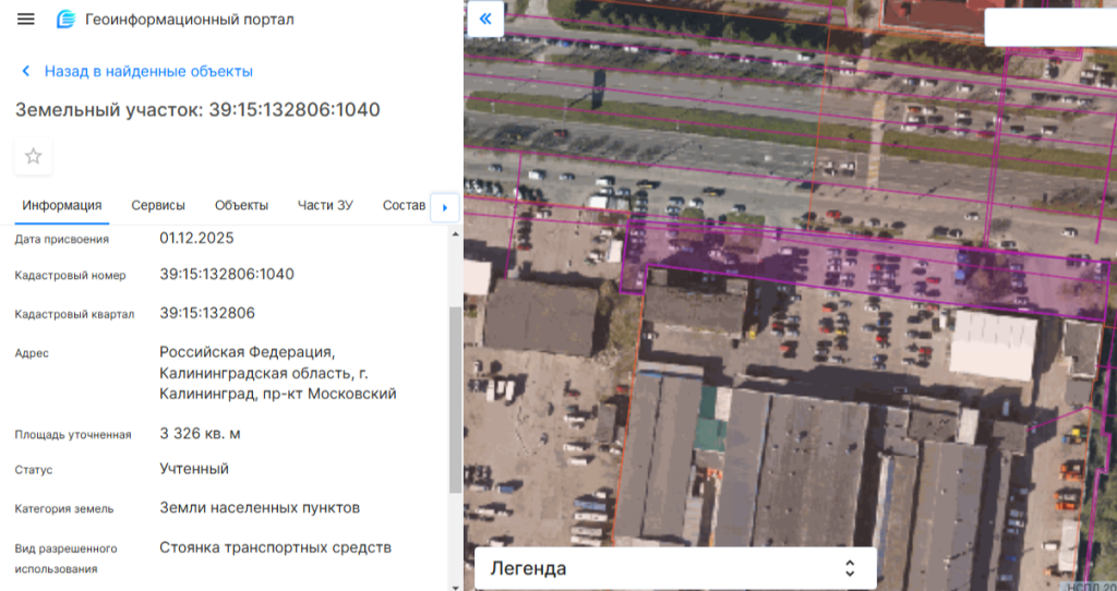 Речь идет об участке 39:15:132806:1040 площадью 3,3 тыс. кв. м с назначением «стоянка транспортных средств» и кадастровой стоимостью 4,83 млн руб. Это северная часть паркинга перед торговым домом «Строитель», причем она никак не была отделена от остальной части парковки. Машины перед строительным супермаркетом парковались свободно и бесплатно в часы работы торгового объекта. В настоящее время «Строитель» в этой локации больше не работает.