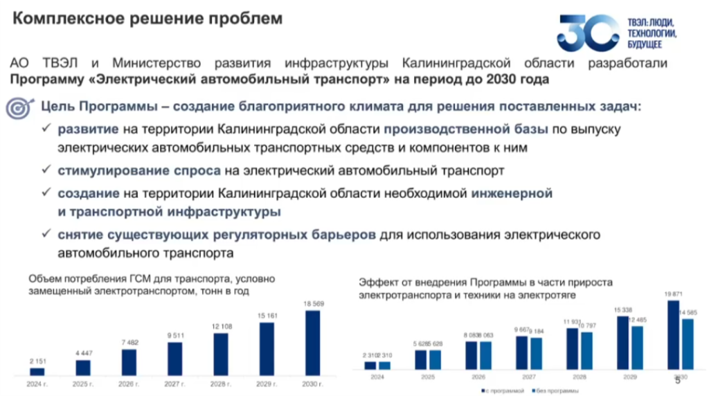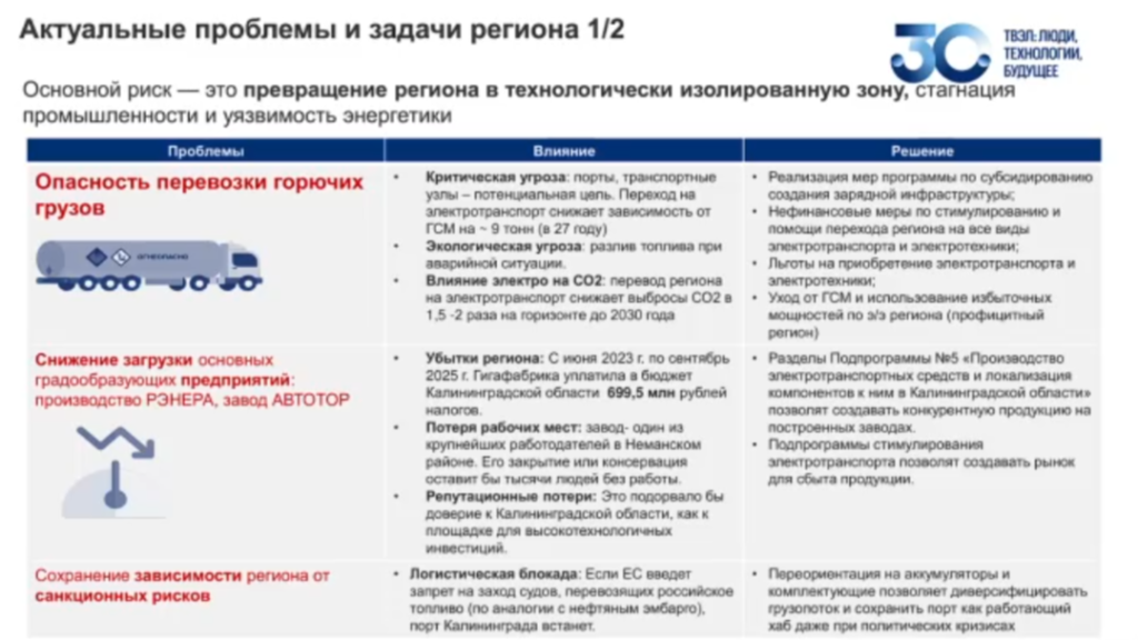 При этом в презентации Кузнецова было акцентировано внимание на рисках, которые существуют при доставке топлива в Калининградскую область. В частности, упоминается сценарий запрета со стороны ЕС на заход судов в наш порт. Переход на электротранспорт, по расчетам «Твэл», может снизить зависимость области от поставляемых ГСМ на 9 тонн. Также отмечалось влияние электротранспорта на экологию.
