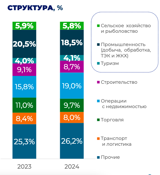При этом на представленном Вероникой Лесиковой слайде было указано, что доля промышленности в структуре ВРП в 2024 году сократилась с 20,5 % до 18,5 %. Основу валового регионального продукта составили операции с недвижимостью (19 %). На транспорт и логистику пришлось 8 %, сельское хозяйство – 5,8 %, туризм — 4,1 %.