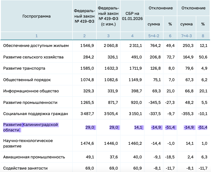 Финансирование госпрограммы «Развитие Калининградской области» в 2025 году составило 14,1 млрд руб., или 48,6 % от изначально запланированных в федеральном бюджете 29 млрд руб. Соответствующие данные приведены в докладе Счетной палаты РФ.