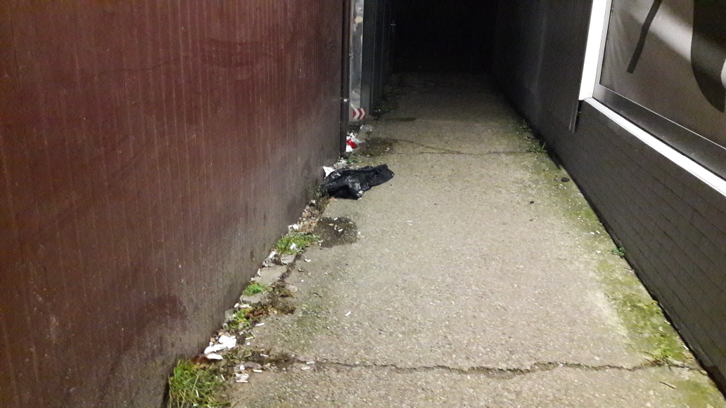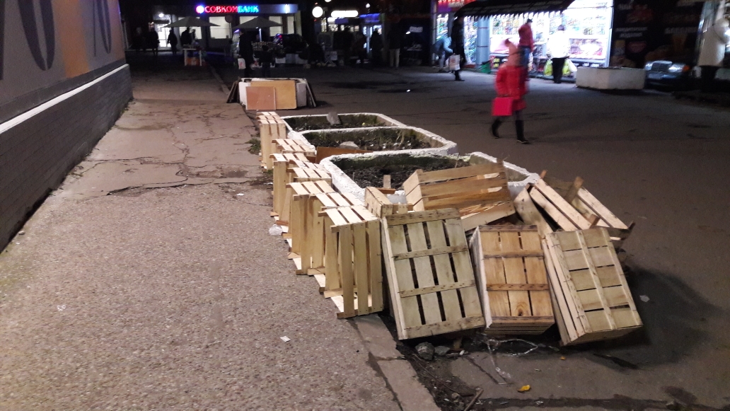Между стеной магазина и торговыми палатками — горы мусора, пустые ящики, пустые бутылки и окурки.