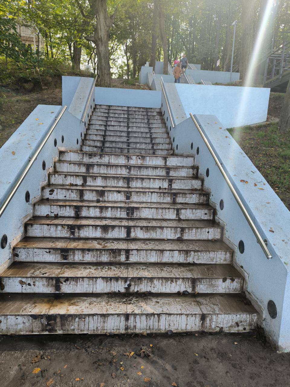 Пионерский: Не прошло и года, а территория вокруг Первого Шанхайского озера приходит в упадок. Дорожки и лестница разваливаются, и очевидно, что работы выполнены некачественно и требуется срочный ремонт.
