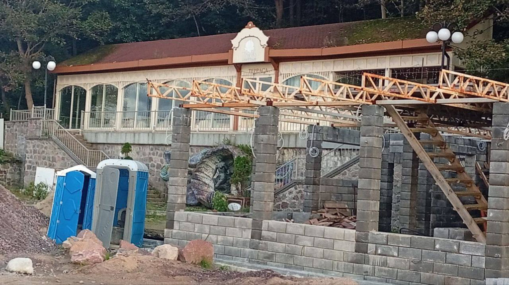 Рядом с кафе "Нимфа" внизу явно обновлялось "в камне" еще одно кафе, причем параллельно со стройкой и реконструкцией этой части променада. Довольно инновационно. Так бы сам променад достраивали, как этот общепит. Сама же скульптура Нимфы в ракушке давно поросла травой.
