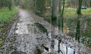 Велодорожка на Куршской косе: Местами проехать по ней невозможно: вся в лужах, грязи, засыпана листвой, ветками деревьев.