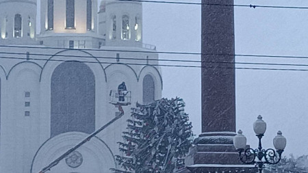 На площади Победы ветер снес верхушку новогодней ёлки.