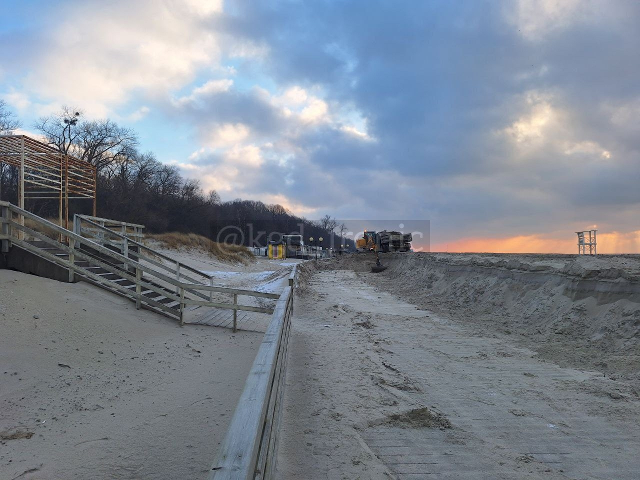 В Янтарном регулярно засыпает песком променад. Подгоняют технику, чтобы его очистить и откопать.