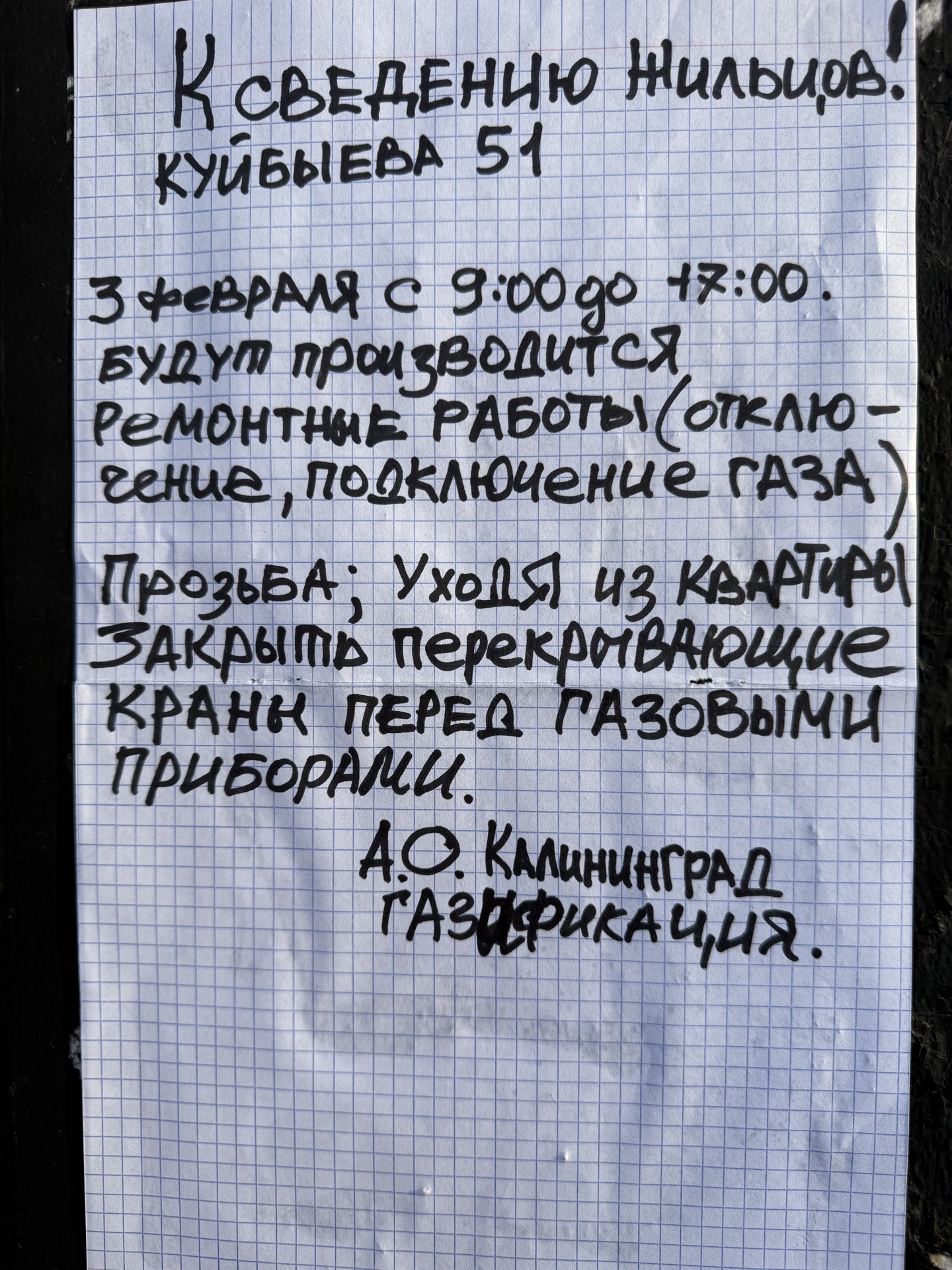 Вот такое объявление от АО "Калининградгазификация" появилось на двери д. 51 по ул. Куйбышева.