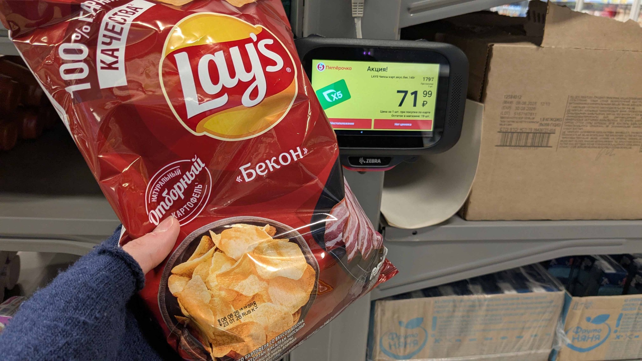 Говорить о том, что в небезызвестной федеральной торговой сети с логотипом «отличника» встречаются «вкусные и отличные» предложения, не приходится. Помимо периодически гнилых яблок, «золотых цен» на картофель, а также маркетинговых уловок в виде печенья за 30 руб., встречаются и «свежие» чипсы меньше, чем за 100 руб. Просматривая приложение сети «отличника», можно было увидеть акцию на чипсы Lays: целых 72 руб. за 140 г. Невиданная щедрость при нынешних ценах. Однако, посмотрев на упаковку, можно увидеть, что срок годности «натурального картофеля с беконом» уже закончился больше двух недель назад - 23.01.2026. А вишенкой на торте является условие такой скидки: карта «отличника». Т.е. просрочки достойны лишь участники клуба. «Пятерочка» выручает.