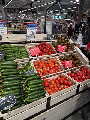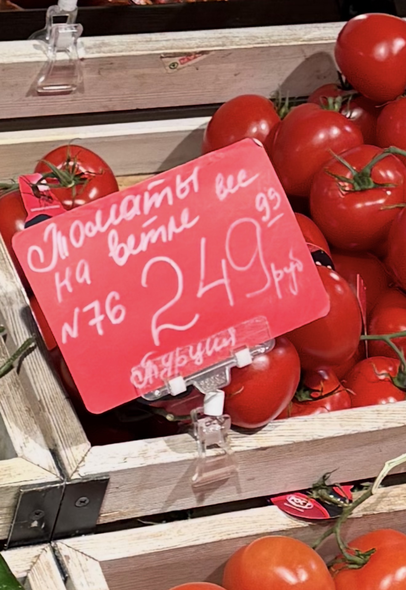 Здесь же «Огурцы гладкие», по цене 399,99 ₽ за кг. И рядом томаты розовые, Азербайджан, по цене 299,99 ₽ за кг. Господа управленцы, что происходит?