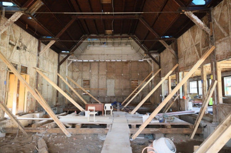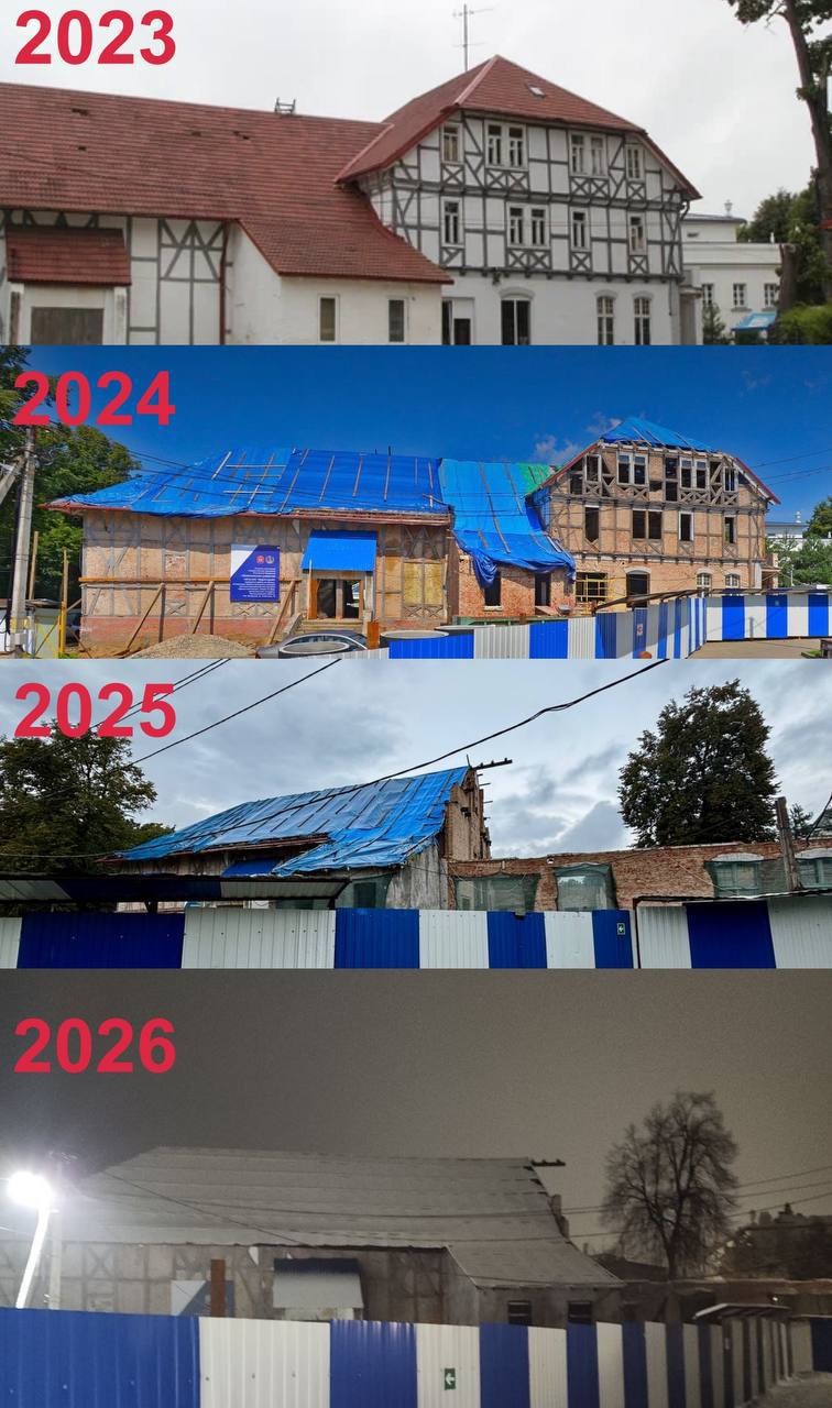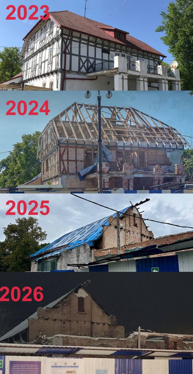 В 2024 году подрядчик начал ремонт, в результате его «работы» рухнула фахверковая конструкция второго этажа. После чего подрядчик быстренько исчез, а работы прекратились. Так и стоит Дом культуры два года без крыши и второго этажа стены продолжают обрушаться.