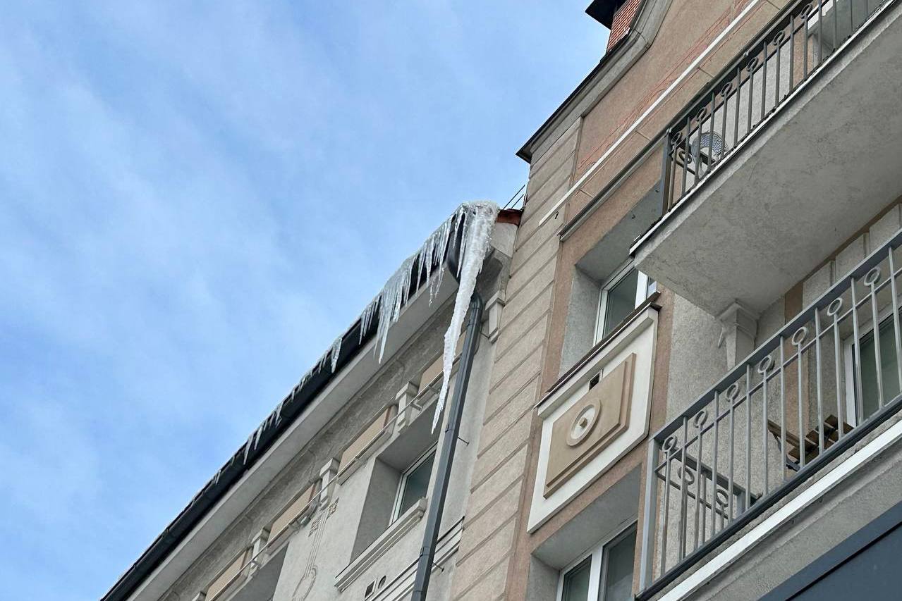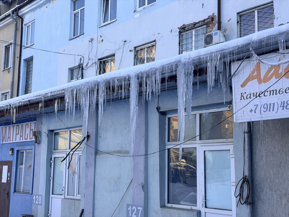 16/2/26: На карнизах калининградских домов выросли метровые сосульки.