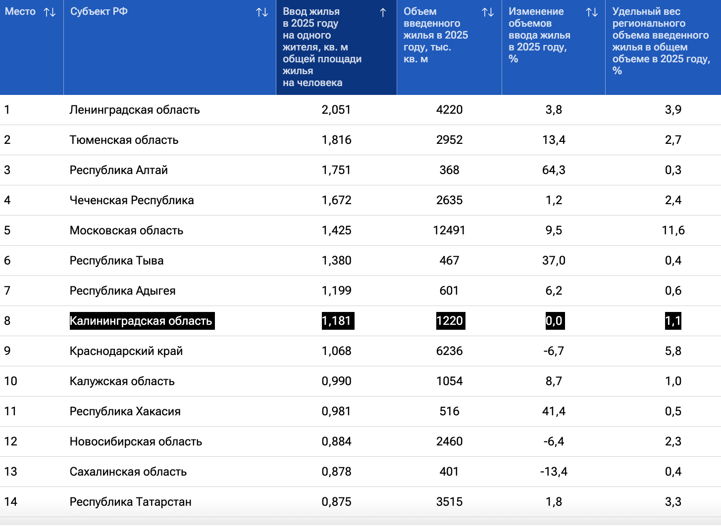 В 2025 году в Калининградской области было введено в эксплуатацию 1,22 млн кв. м жилья, что соответствует показателю прошлого года. Соответствующие данные приводит РИА Рейтинг. На одного жителя региона было введено в эксплуатацию более 1,18 кв. м жилых площадей. По данному показателю Калининградская область заняла 8 место в РФ. Годом ранее в аналогичном рейтинге регион занял пятое место. На Калининградскую область пришлось 1,1 % от всего введенного жилья в общероссийском объеме, это 24-й показатель среди регионов РФ. В лидерах рейтинга Ленинградская область, где было сдано порядка 2,05 кв. м на человека и всего более 4,22 млн кв. м жилой недвижимости), Московской и Тюменской областей (1,42 и 1,81 кв. м на человека соответственно), а также республика Алтай (1.75) и Чечня (1,67). Последние места в исследовании заняли Магаданская (0,12 кв. м на человека) и Мурманская (0,15) области, а также Чукотский автономный округ (0,25), Еврейская автономная область (0,27) и Коми (0,32). Москва с 0,56 кв. м на человека заняла 54 место, Санкт-Петербург — 69-е (0,47). В абсолютном выражении больше всего жилых площадей было построено в Московской области — 12,5 млн кв. м. На втором месте — Москва (7,39), на третьем — Краснодарский край (6,23). В целом по РФ было введено в эксплуатацию 108,1 млн кв. м жилой недвижимости, что 0,4 % больше 2024 года. Ввод жилья на одного человека составил 0,74 кв. м.