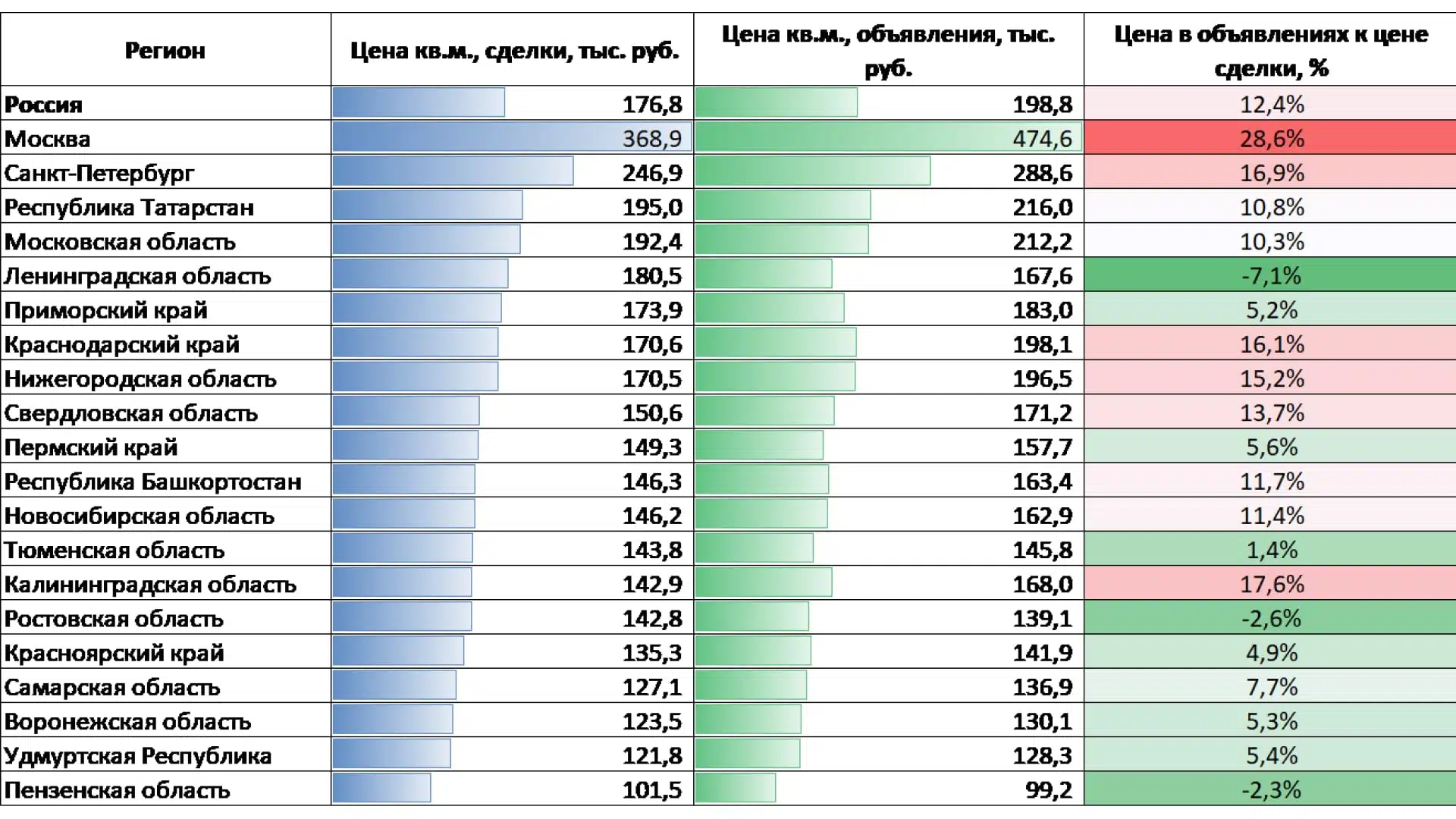 В целом по РФ стоимость квадратного метра на первичном рынке в сентябре выросла на 0,4 % до 176,8 тыс. руб. Цены продолжают увеличиваться пятый месяц подряд. Снизилась стоимость первички относительно августа в Санкт-Петербурге (–2,3 %, до 246,9 тыс. руб.), Пермском крае (–0,5 %, 149,3 тыс. руб.) и Самарской области (–0,4 %, 127,1 тыс. руб.). В Ленинградской области стоимость кв. м за месяц увеличилась на 2,5 %, до 180,5 тыс. руб. В тройке лидеров также Москва: +1,3 % (168,9 тыс. руб. за кв. м). Разница между ценами квадратного метра в объявлениях и сделках на первичном рынке по РФ в сентябре уменьшилась до 12,4 % после 14,3 % в августе. Самая большая разница между ценой в объявлении и ценой сделки отмечена в Москве — 28,6 %, и Курской области — 23,5 %. На четвертом месте — Санкт-Петербург: 16,9 %. В трех регионах стоимость сделки оказалась выше, чем в объявлении, а именно в Ленинградской, Ростовской и Пензенской областях: –7,1 %, –2,6 %, –2,3 % соответственно. «Стоимость увеличивается не выше инфляции: в сентябре рост год к году составил 5 %. Доля ежемесячных продаж выросла, однако она уже больше года не может превысить 2 % от всего объема стройки. Разрыв между ценой предложения и ценой сделки, который показывает степень уверенности продавца, вновь снизился и продолжает находиться ниже значений 2022–2023 годов. Это увеличивает вероятность разворота цен в сторону снижения в ближайшие месяцы или же их фиксации на текущем уровне. При этом драйверами роста стоимости остаются Москва, Московская и Ленинградская области», — прокомментировали авторы исследования.