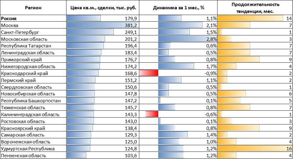В целом по РФ стоимость квадратного метра на первичном рынке в октябре выросла на 1,1 % до 179,9 тыс. руб. Цены продолжают увеличиваться четырнадцатый месяц подряд. В числе лидеров по стоимости строящегося жилья остаются Москва (381,2 тыс. руб. за кв. м), Санкт-Петербург (249,1), Московская область (201,2), Татарстан (196,4) и Ленинградская область (183,4). Среди крупнейших регионов наибольший рост цен за месяц на новую недвижимость зафиксирован в Московской области (2,8 %) и Москве (2,1 %). Самые высокие годовые темпы роста отмечены в Удмуртии (16,6 %), Ленинградской и Нижегородской областях (12,4 % и 11,5 % соответственно). Самое ощутимое снижение цен по сравнению с октябрем среди крупнейших регионов отмечено в Краснодарском крае (-0,9 %) и Калининградской области (-0,6 %). «По итогам ноября 2025 года средняя стоимость 1 кв. м на первичном рынке жилья в России выросла к показателям ноября 2024-го на 6,1 %. При этом доля ежемесячных продаж составила 2,1 % общего объема стройки. Разрыв между ценой предложения и ценой сделки, показывающий степень уверенности продавца, сократился за счет быстрого роста цен сделок на фоне стагнации цен предложения. Увеличение цен в сделках эксперты связывают с активным обсуждением планов по переформатированию семейной ипотеки», — прокомментировали авторы исследования.