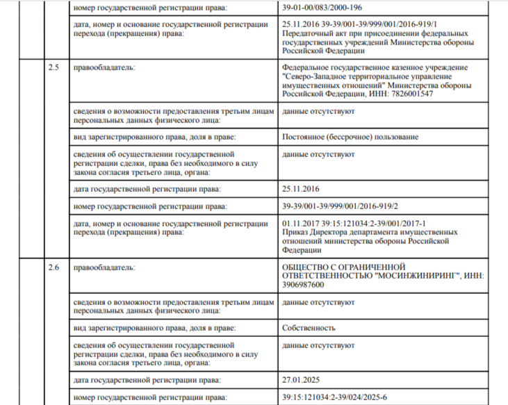 В интересах компании «Мосинжиниринг» Георгия Мнацаканова готовится перевод под жилую застройку 2,15 га под бывшими складами на ул. Борзова, 90а в Калининграде. Территория примыкает к межрайонному экзаменационно-регистрационному отделу ГИБДД на ул. Осенней. Застройщик запросил изменение генплана в части исключения участка 39:15:121034:2 из коммунально-складской зоны и установления в отношении него зоны смешанной и общественно-деловой застройки. Проект корректировки генплана рассматривался на общественных обсуждениях, которые проводила администрация Калининграда по требованию регионального министерства градполитики в декабре. Как следует из ЕГРН, массив на Борзова, 90а был приобретен компанией «Мосинжиниринг» 27 января 2025 года у структуры Минобороны РФ — АО «Окружной материальный склад Московского округа Военно-воздушных сил и ПВО». С 2000 до 2016 года имуществом на ул. Борзова, 90а распоряжалась «Калининградская квартирно-эксплуатационная часть района» Минобороны РФ. В ноябре 2016 года комплекс перешел в постоянное бессрочное пользование ФГКУ «Северо-Западное территориальное управление имущественных отношений» Минобороны РФ. С 2020 года калининградскими складами на Борзова, 90а распоряжалось АО «Отдельный материальный склад №7», которое было зарегистрировано по тому же адресу. Однако в июне 2024 года структура была реорганизована и присоединена к АО «Окружной материальный склад Московского округа» («ОМС»).