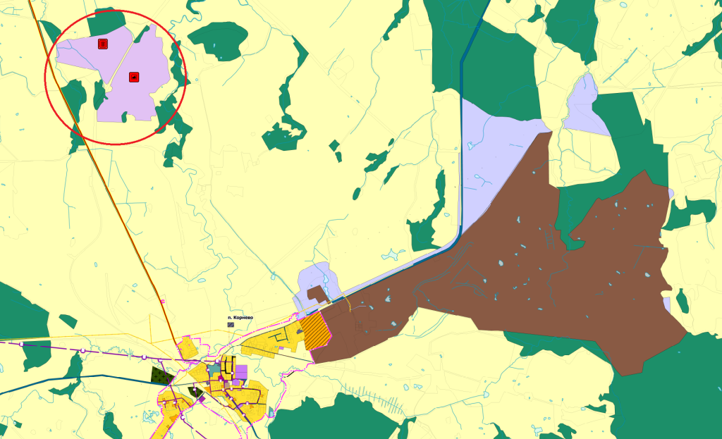 В соответствии с актуальным классификатором ВРИ, «специальная деятельность» подразумевает размещение, хранение, захоронение, утилизацию, накопление, обработку, обезвреживание отходов производства и потребления, медицинских отходов, биологических отходов, радиоактивных отходов, а также скотомогильников, мусоросжигательных и мусороперерабатывающих заводов, полигонов по захоронению и сортировке мусора и отходов. Вместе с тем отметим, что в генплане Багратионовского городского округа от 23 декабря 2022 года указанный массив оказался в функциональной производственной зоне для размещения различных производственных предприятий, сопутствующей инженерной и транспортной инфраструктуры (отмечена на схеме темно-коричневым цветом). Также в указанной зоне разрешается строительство коммерческих предприятий, допускаемых к размещению в промзонах. Для сравнения, другой крупный участок с кадастровым номером 39:01:000000:1233 площадью 124 га севернее Корнево, который был предоставлен компании-концессионеру «Сибинвестрой» для строительства полигона ТКО и мусоросортировочного комплекса, по генплану находится в функциональной зоне складирования и захоронения отходов (отмечена фиолетовым цветом). Однако вид разрешенного использования этого массива идентичный — под «специальную деятельность». Землевладение ранее было выведено из категории сельхозземель в земли промышленности. Спустя 6 лет после подписания концессии мусорный полигон до сих пор не построен. Между участком бывшего военного полигона, который вывели под «специальную деятельность», и массивом под мусоросортировку и полигон для захоронения отходов не менее 6 км по прямой. Территориально это разные трассы: к первому ведет дорога из поселка Медовое, ко второму — дорога от Ладушкина через «берлинку».